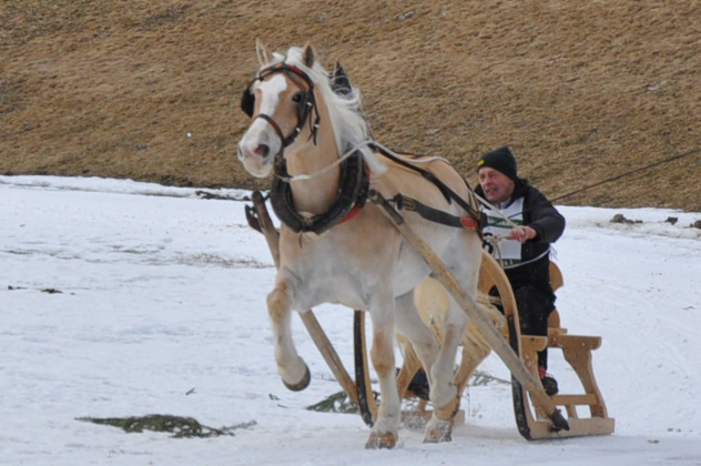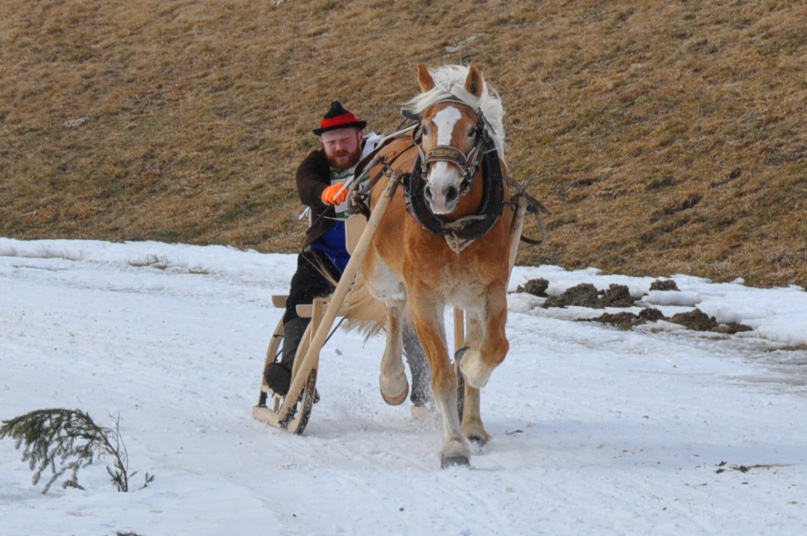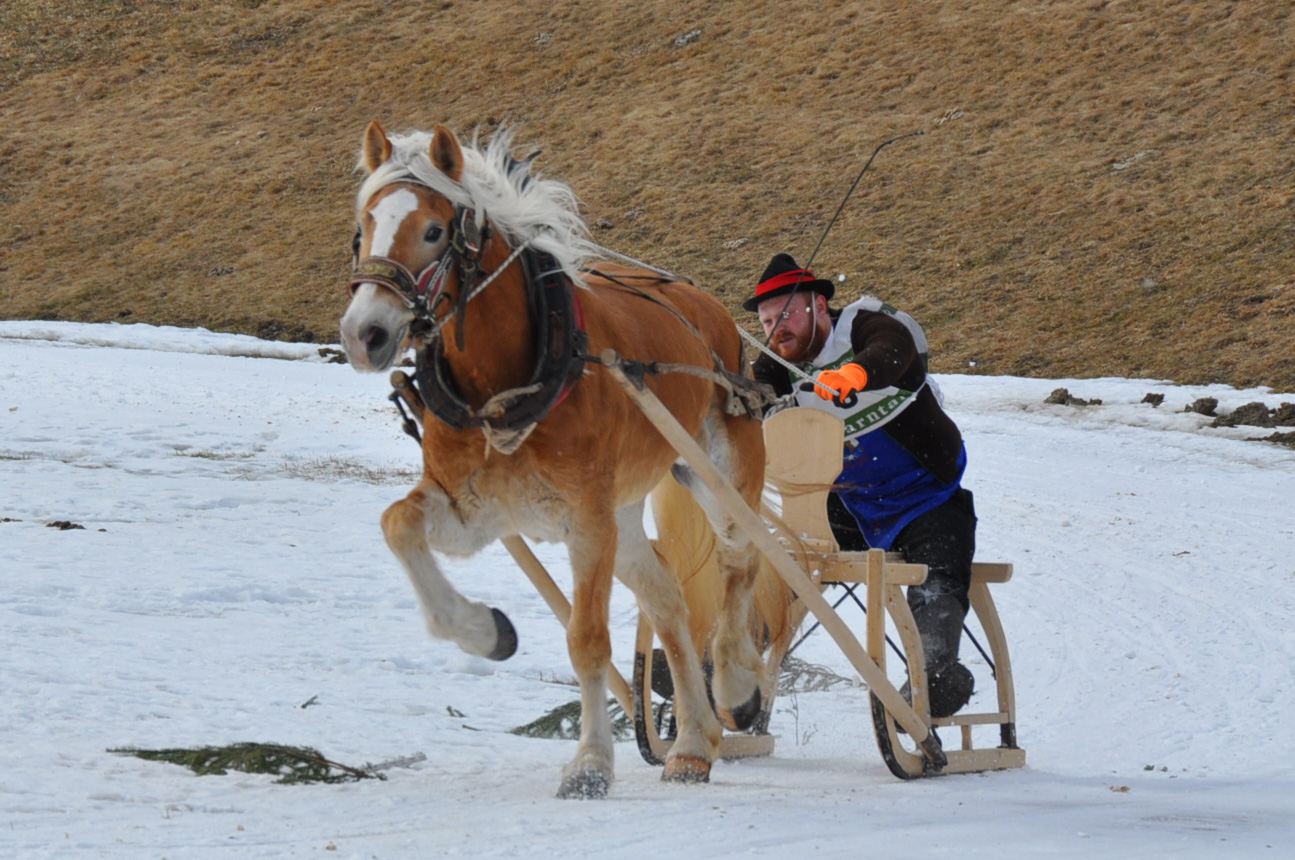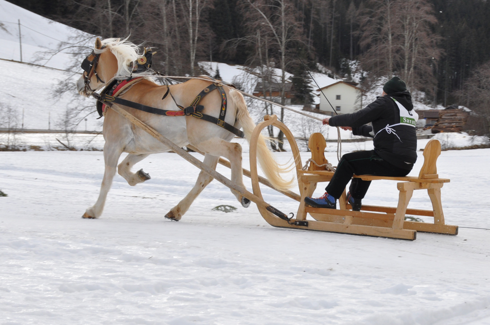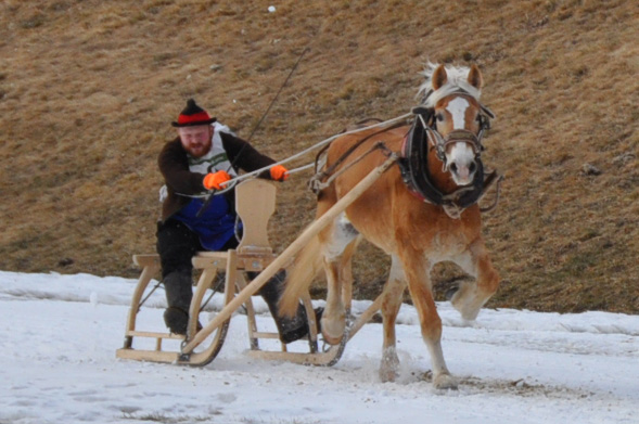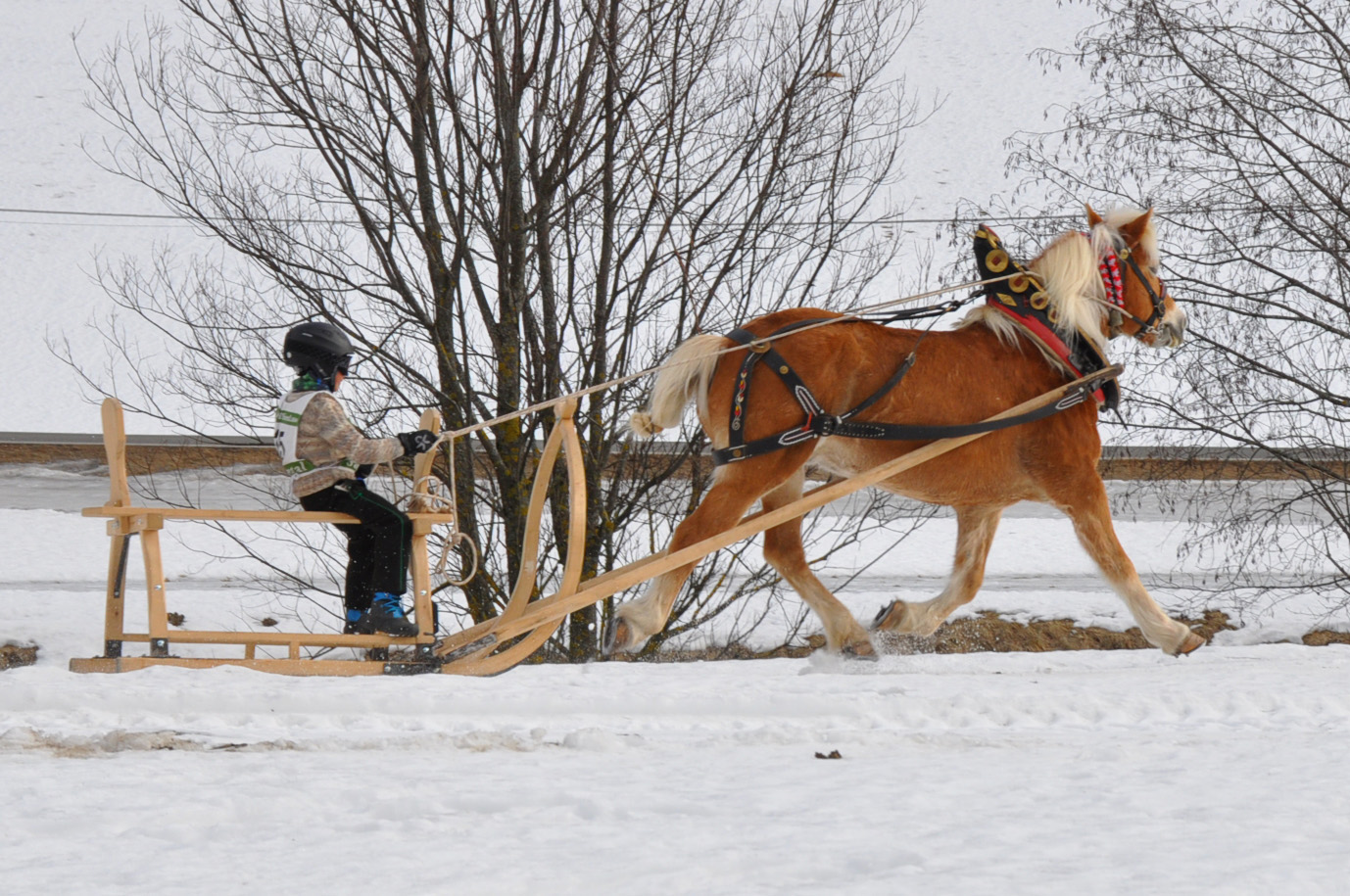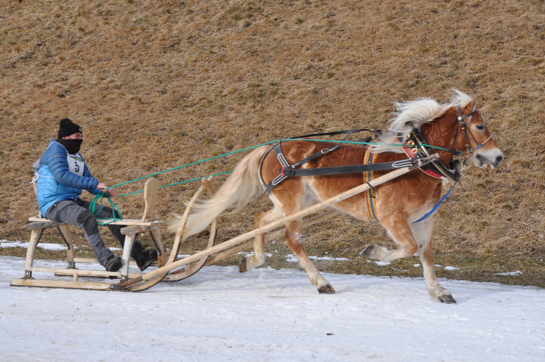 It’s that time of the year – time for the Val Sarentino/Sarntal Haflinger Breeders’ Association’s annual sleigh race and skijoring contest at the Rabensteiner inn and farmstead in Mules/Muls. And on Saturday 22 January 2022, crowds from near and far braved fierce gusts of icy wind and excitedly cheered on the Haflingers racing in a number of categories with their golden winter coats glistening in the sun.