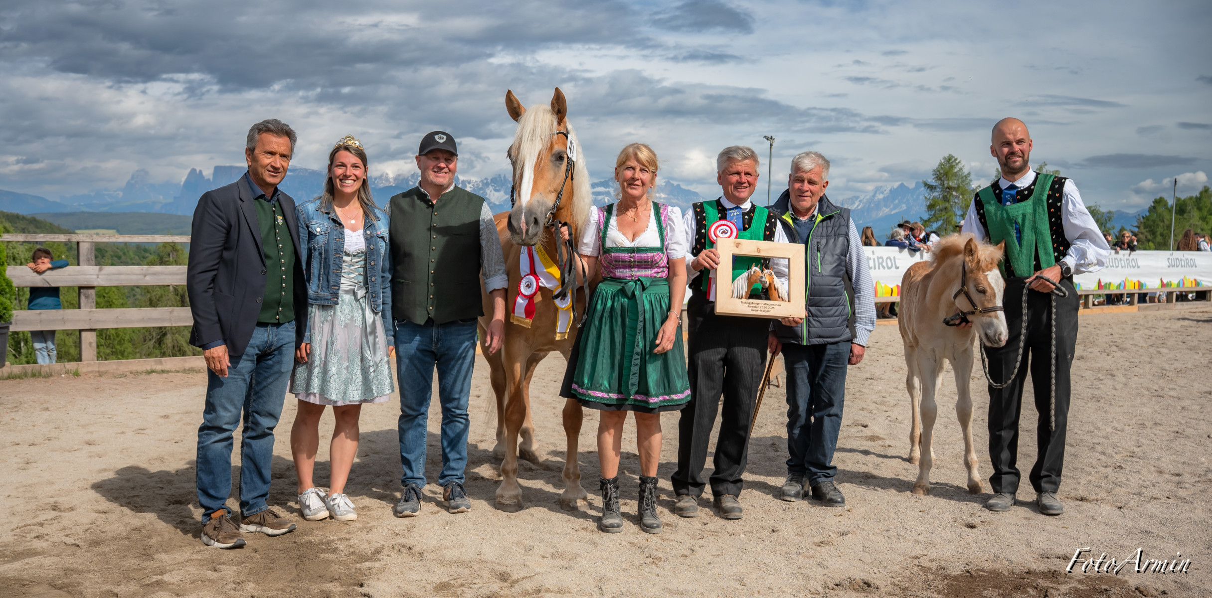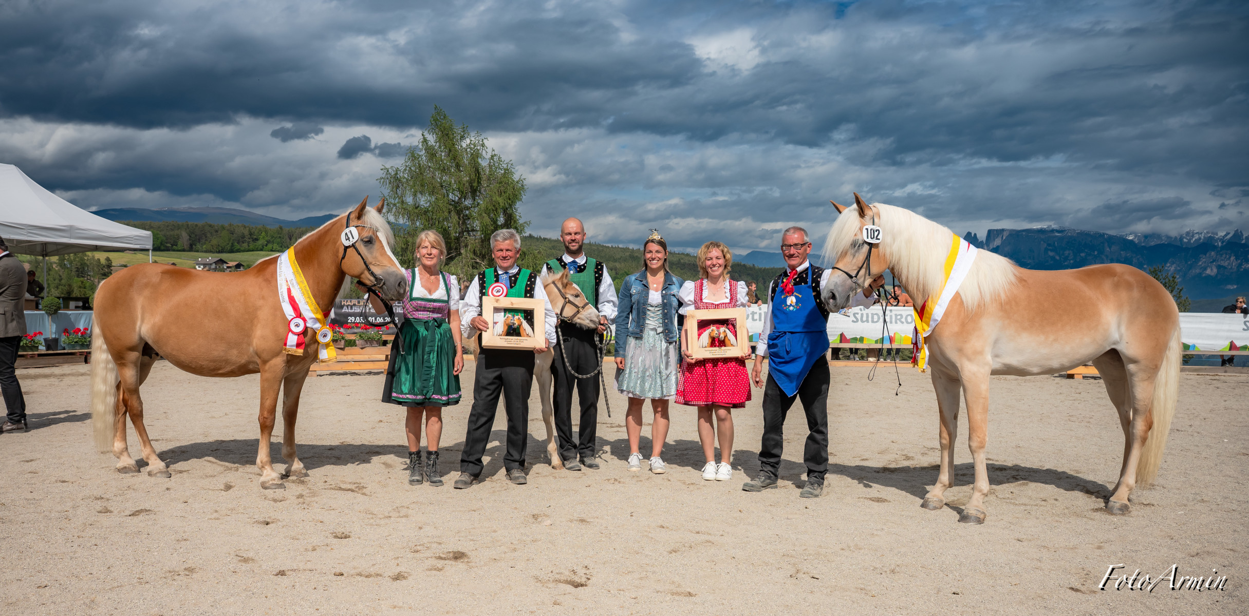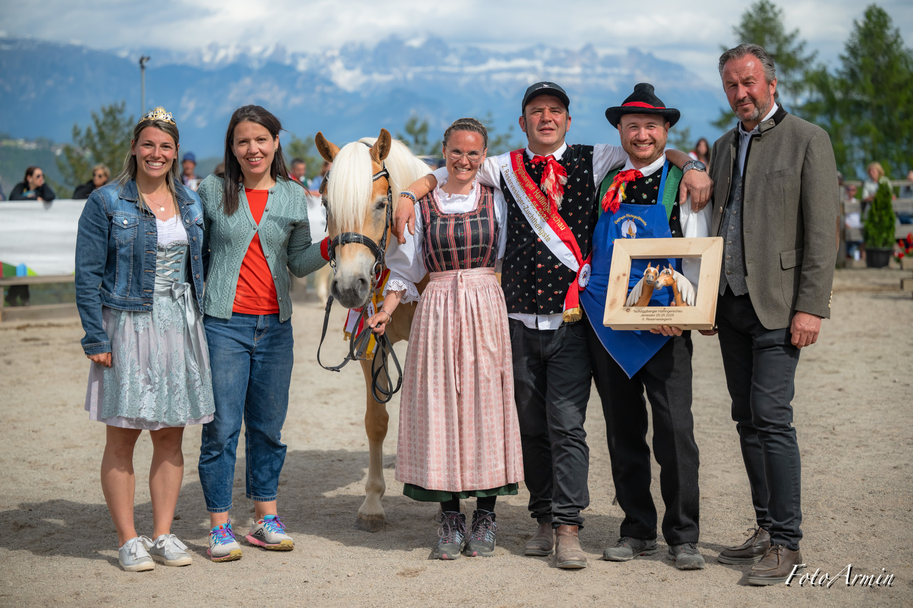 Awards ceremony of Monzoccolo/Tschögglberg most beautiful Haflinger horses: (from left) Franz Gufler, winner VIONA BZ28389 with owner Waltraud Innerhofer, Manuel Gufler, Haflinger Ambassador Sandra Robatscher, Martina Plattner, runner-up F.SORAYA-R BZ31197 with owner Josef Reiterer, Alexander Mittelberger and EVVIVA BZ30855 (3rd place) with owner Carmen Egger