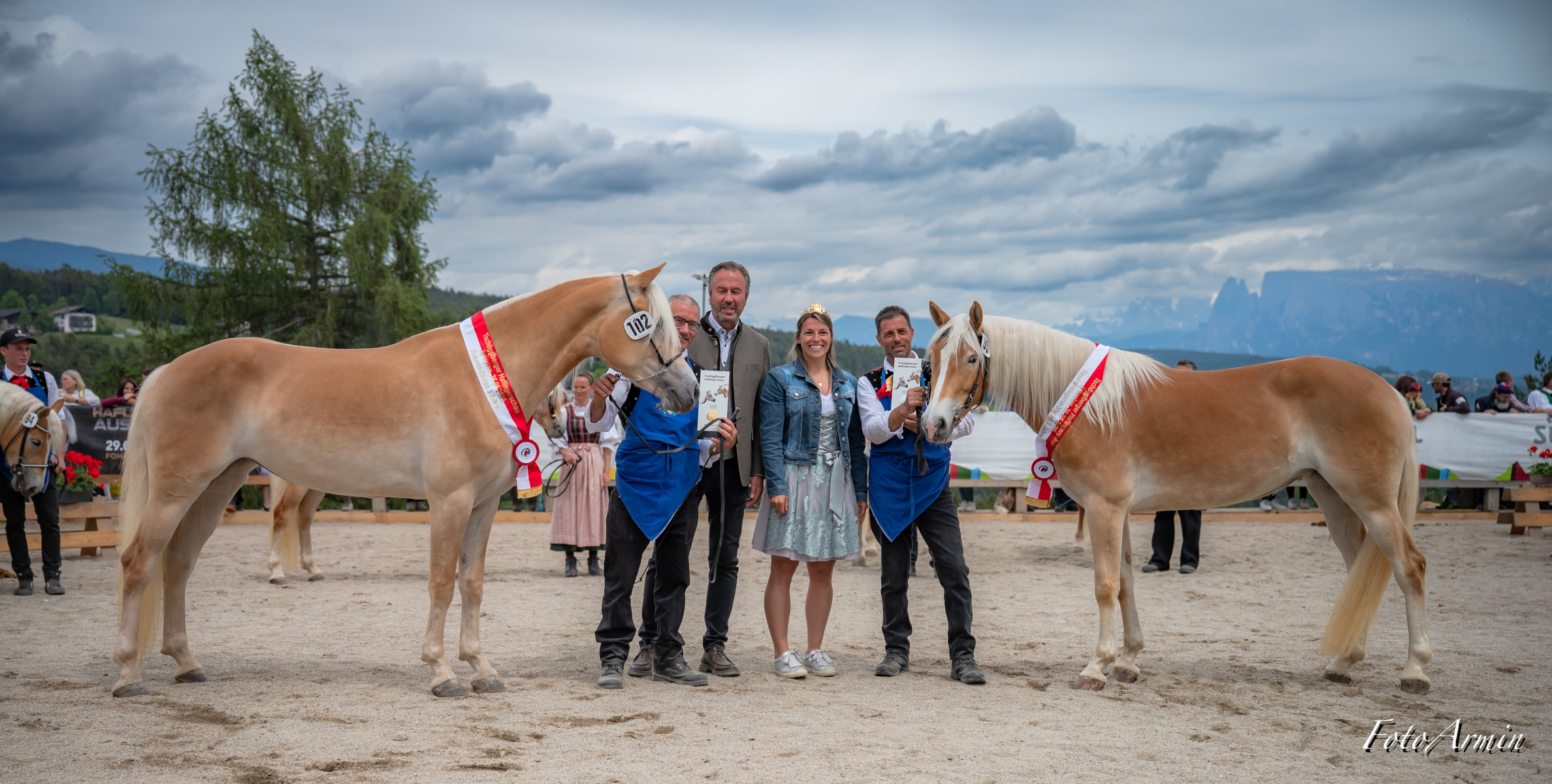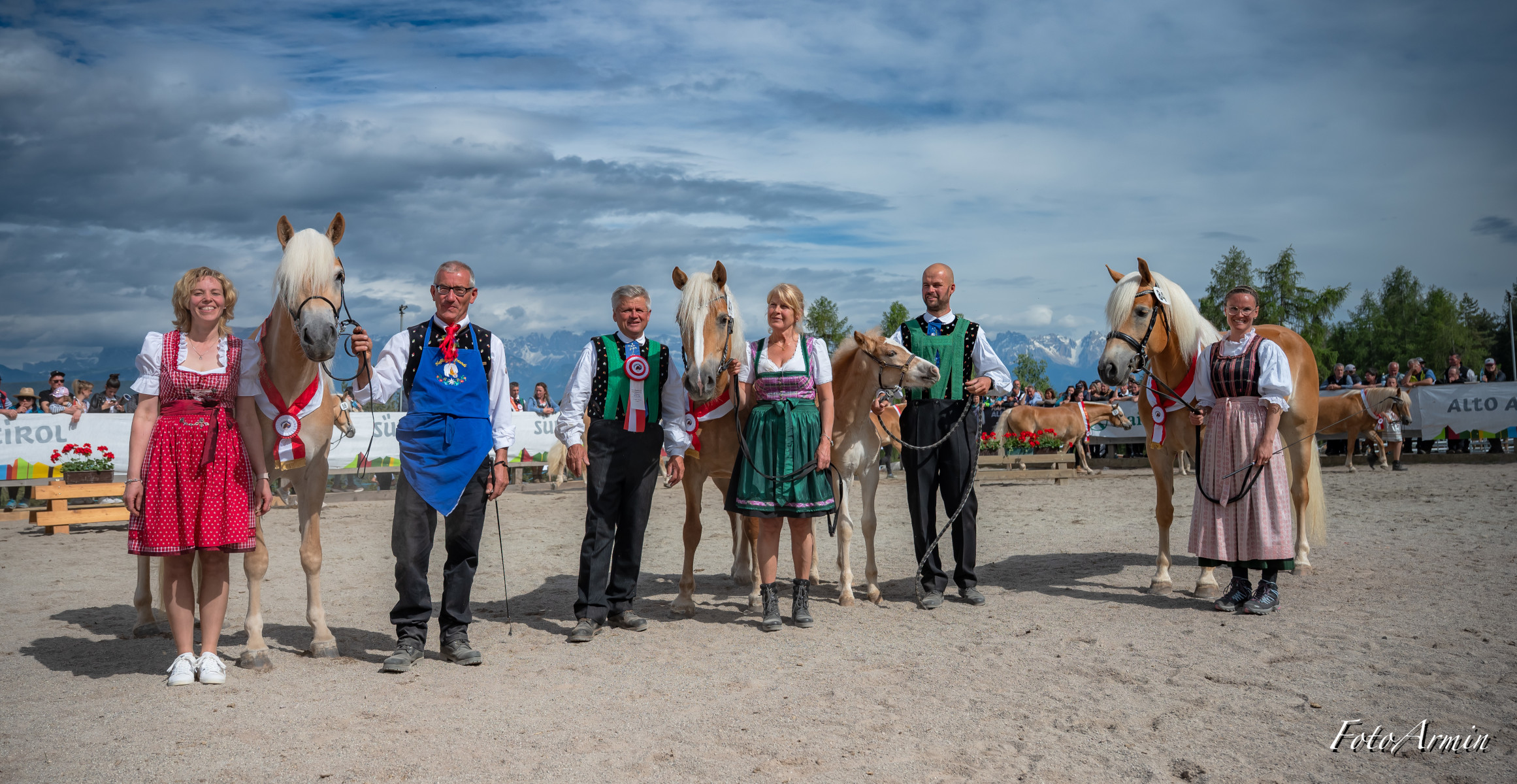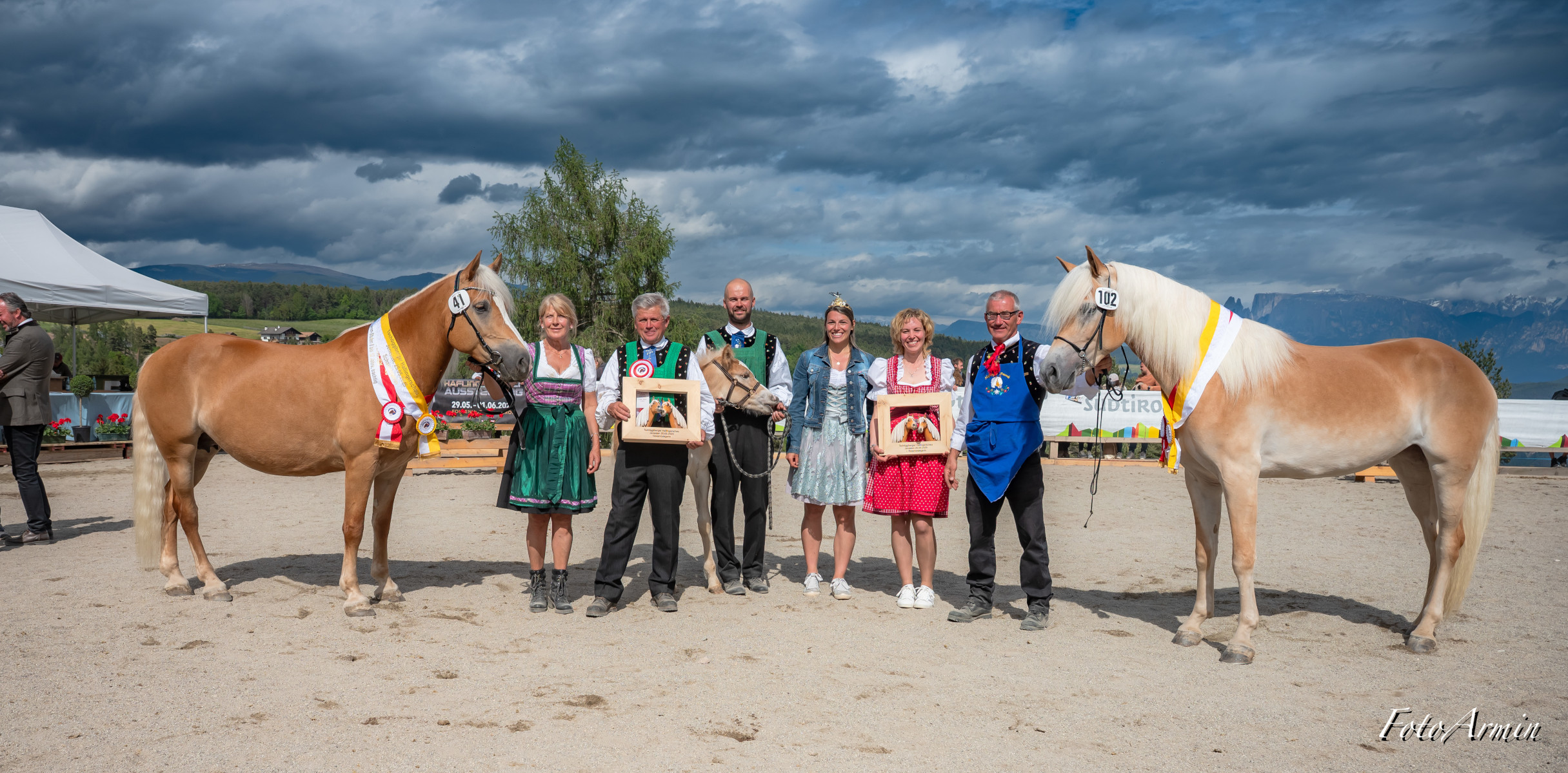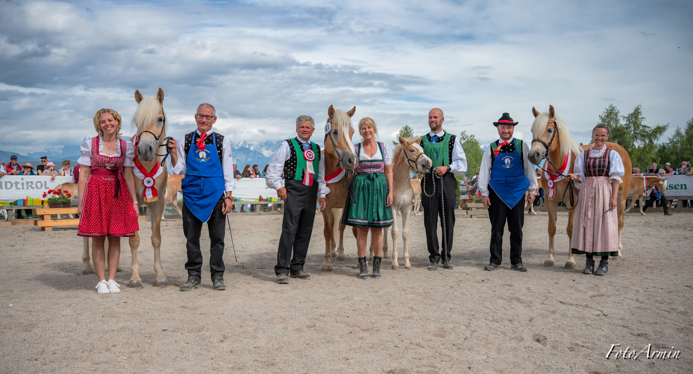 Awards ceremony of Monzoccolo/Tschögglberg most beautiful Haflinger horses: (from left) Franz Gufler, winner VIONA BZ28389 with owner Waltraud Innerhofer, Manuel Gufler, Haflinger Ambassador Sandra Robatscher, Martina Plattner, runner-up F.SORAYA-R BZ31197 with owner Josef Reiterer, Alexander Mittelberger and EVVIVA BZ30855 (3rd place) with owner Carmen Egger