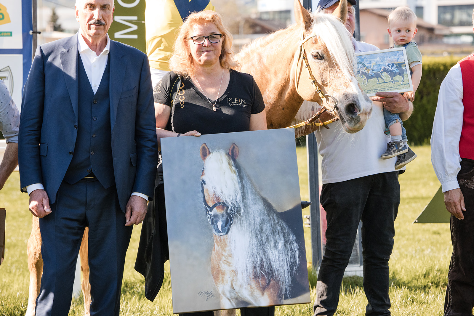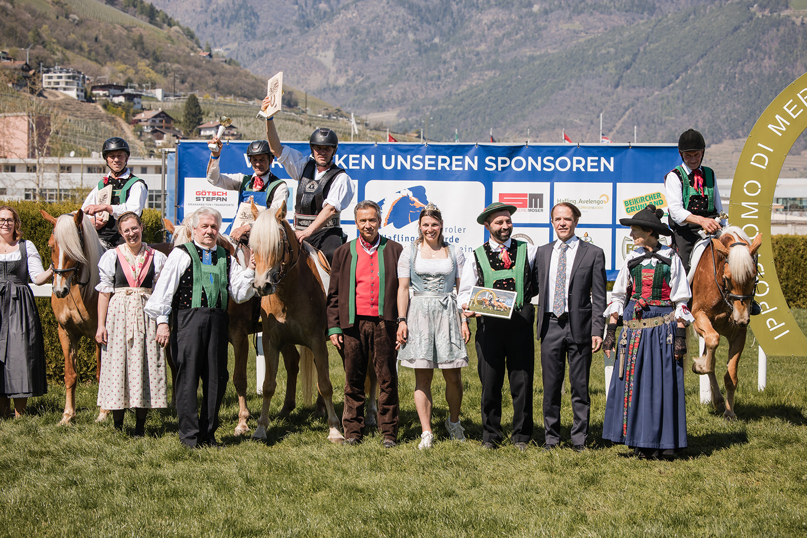 Final race award ceremony: (from left) runner-up Kathrin Erschbamer on BIZARRA HU BZ29649 (owner: Georg Gasser from San Genesio/Jenesien), winner ZARINA BZ28761 with rider Evi Plattner and ELEKTRA BZ30742 with Lena Gschnitzer (3rd place), both owned by Karin Zöggeler from San Genesio/Jenesien Katharina Zeller, Mayor of Merano/Meran, summed it up in her opening remarks: "May the Easter Monday Haflinger Gallop Races continue to delight countless people, forge links between generations and be passed down as a vibrant symbol of our culture and our bond with this region."