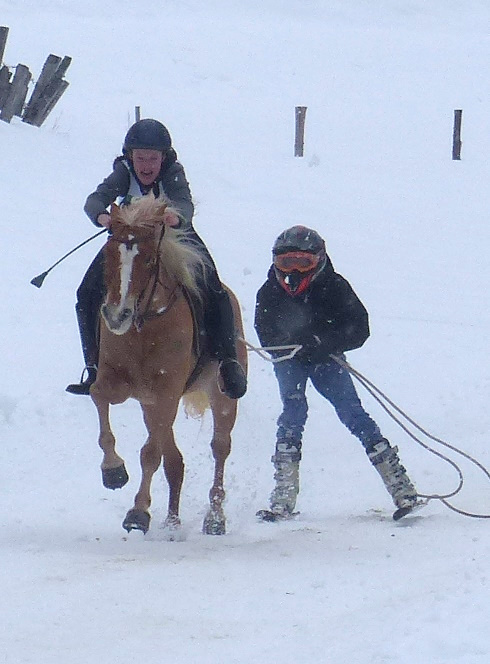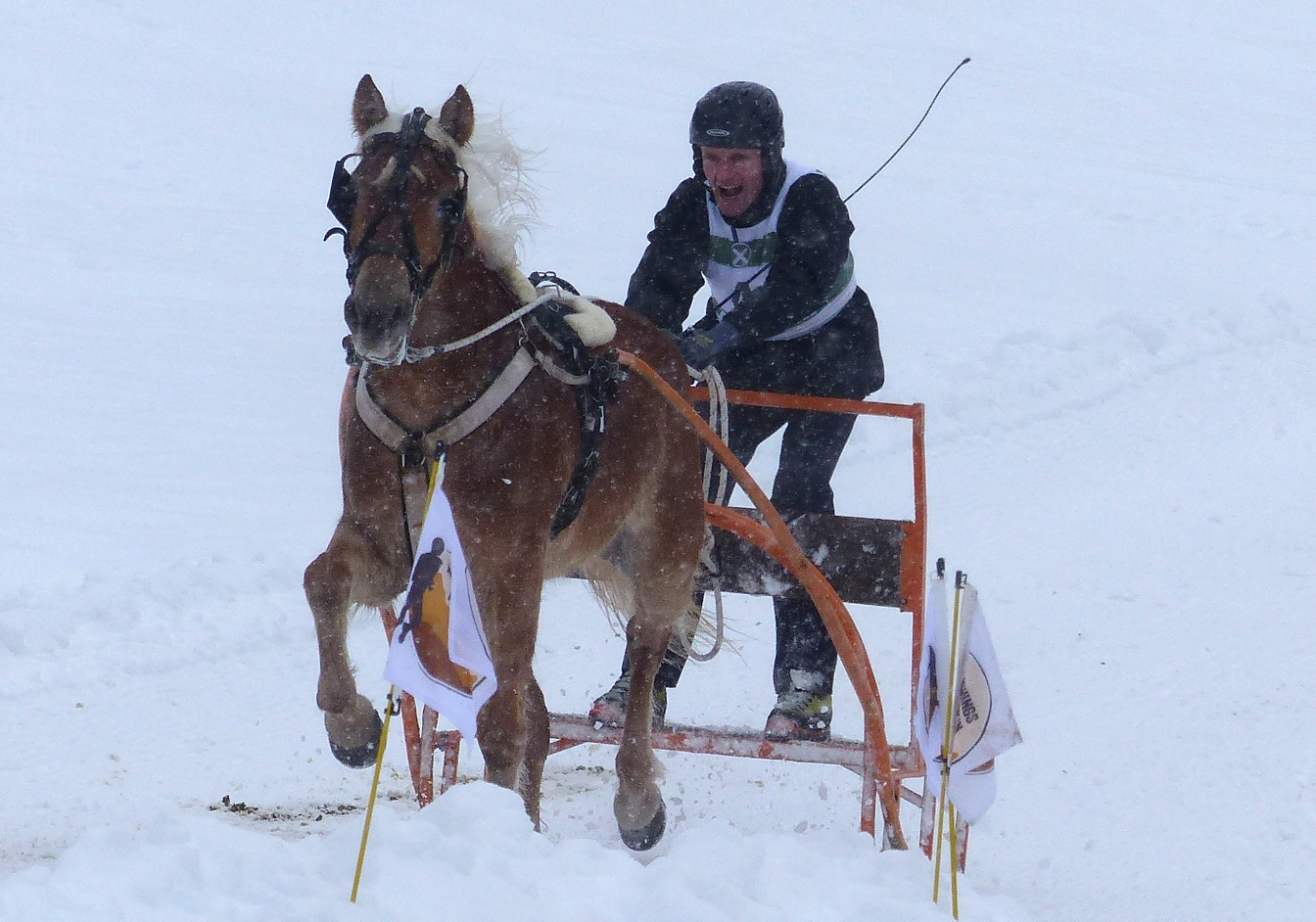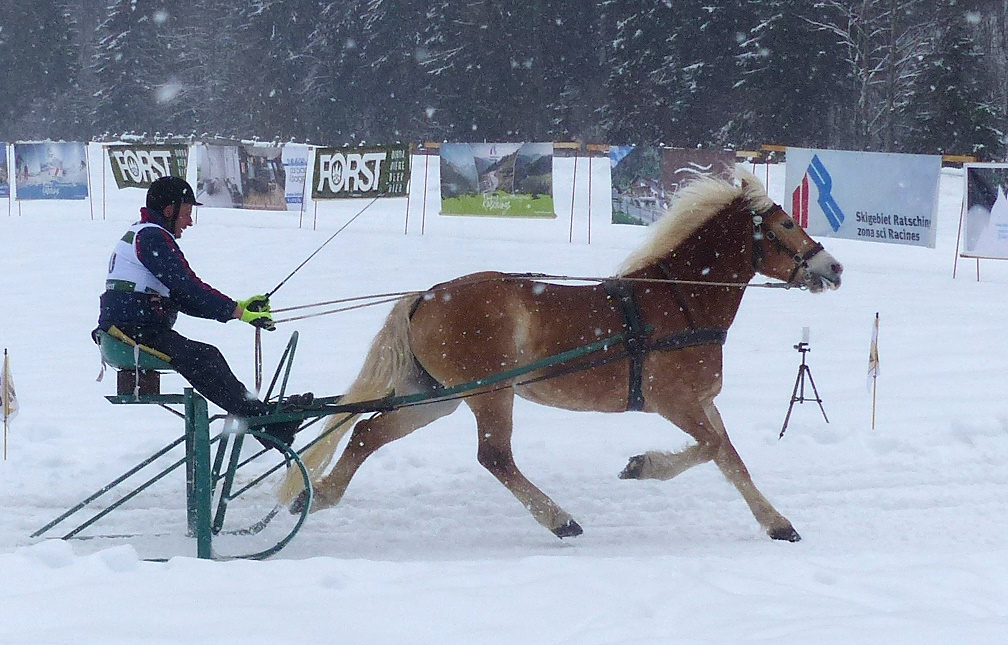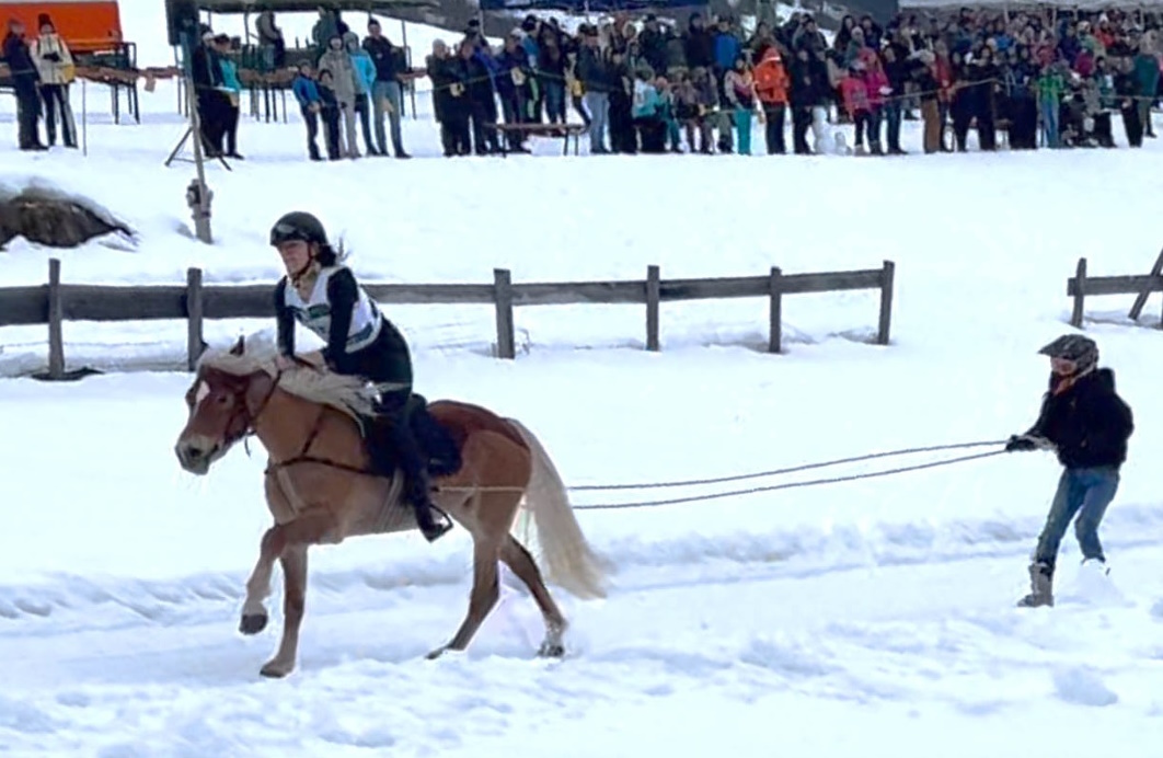 La campionessa provinciale di skijöring (cat. puledre di 3 anni) FINI II BZ31098, di proprietà di Erwin Schrott, con Jana Schrott in sella e Tobias Alber sugli sci