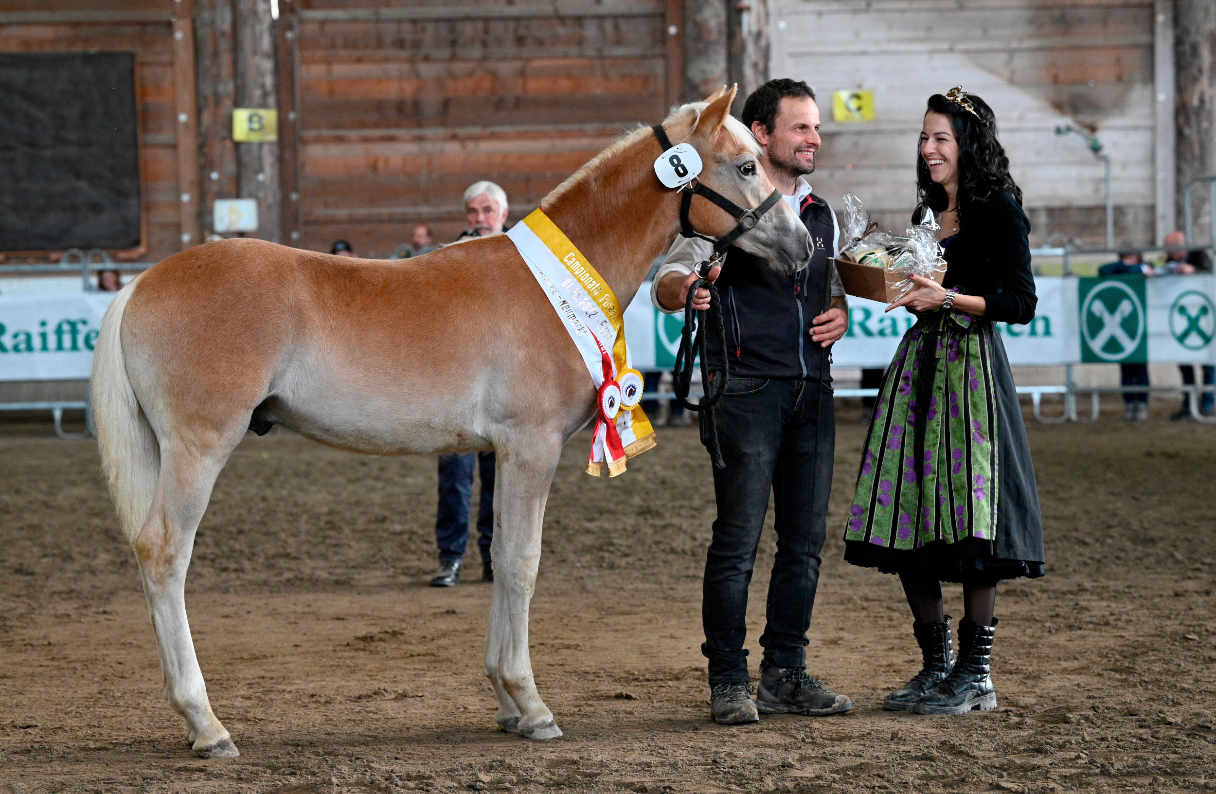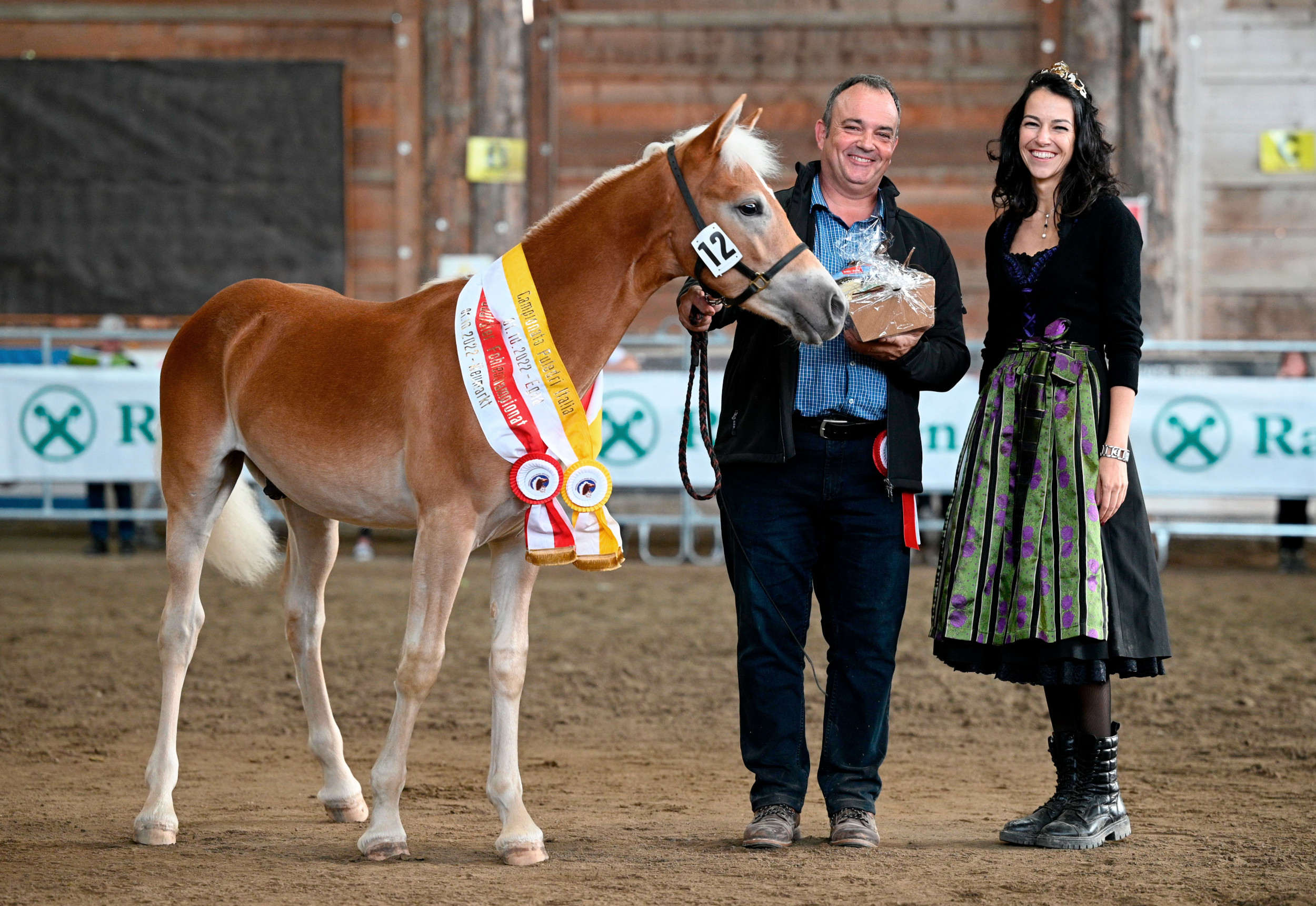 Der Sieger bei den Hengstfohlen AXEL-F BZ31309 mit Besitzer Simon Dapoz aus Abtei und Haflinger-Königin Andrea Aster