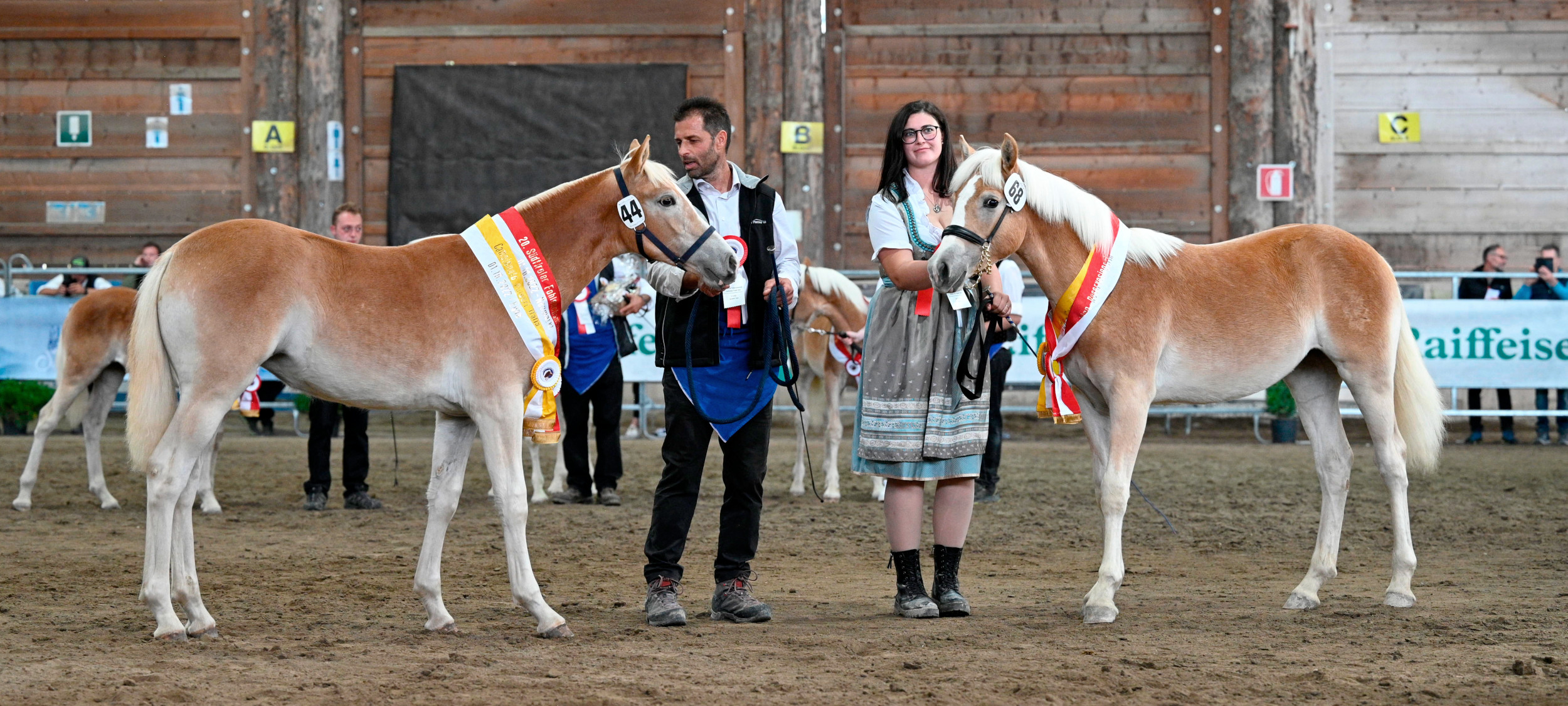 Die schönsten Stutfohlen (v.l.): Siegerin FEADORA BZ31146 mit Besitzer Siegfried Plattner aus Jenesien und Reservesiegerin FARA BZ31011 von Markus Pflug aus Moos in Passeier